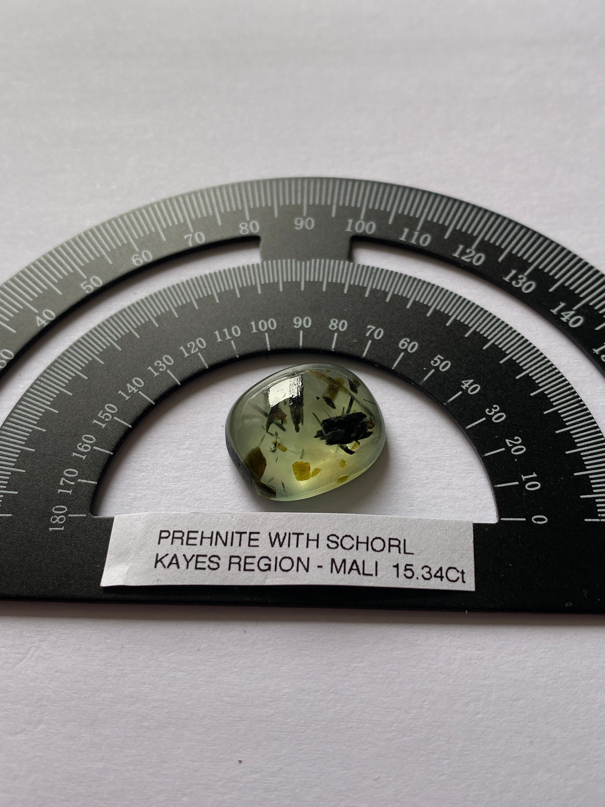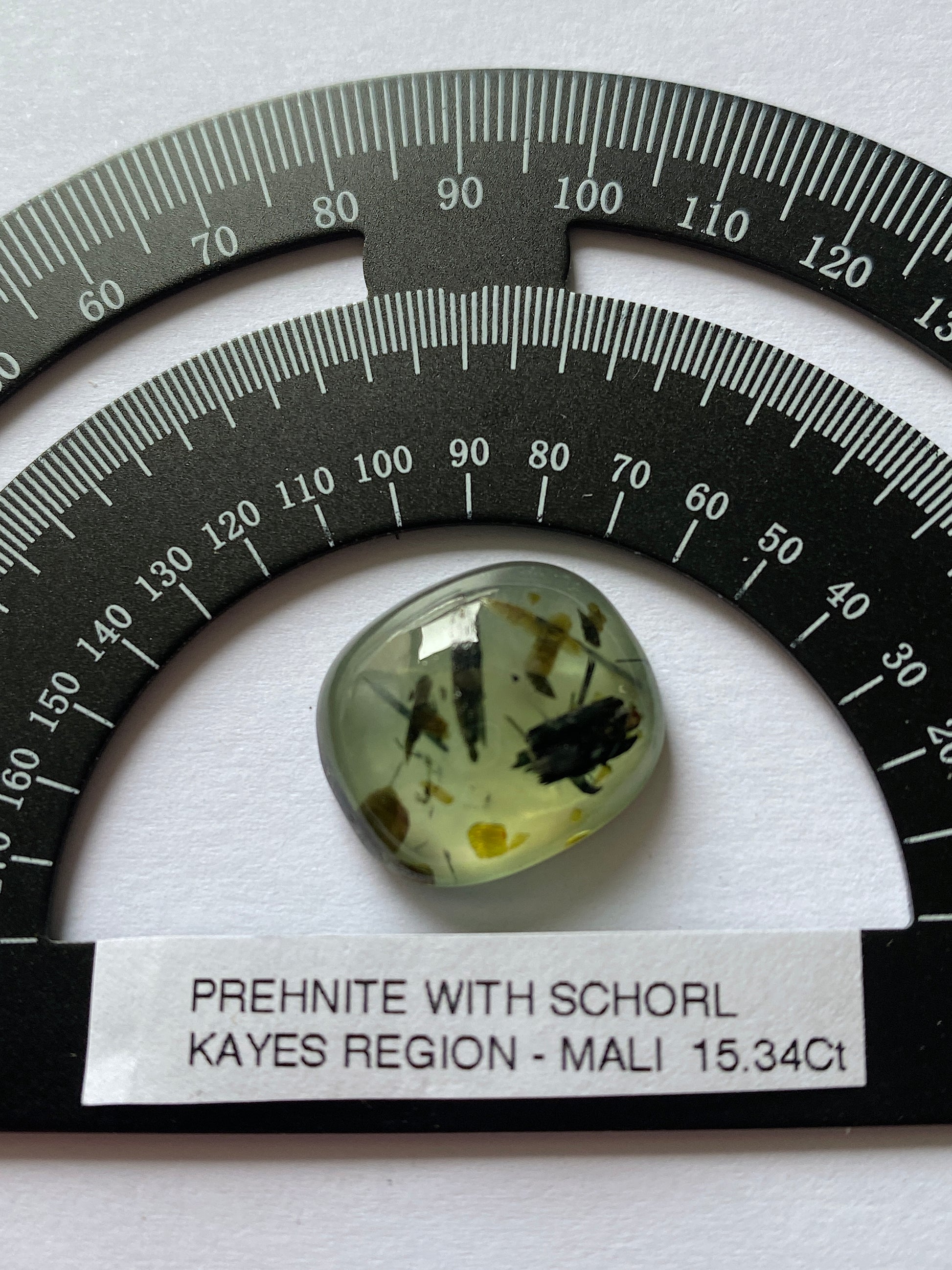 GEMSTONE : PREHNITE WITH SCHORL [ETC] INCLUSIONS