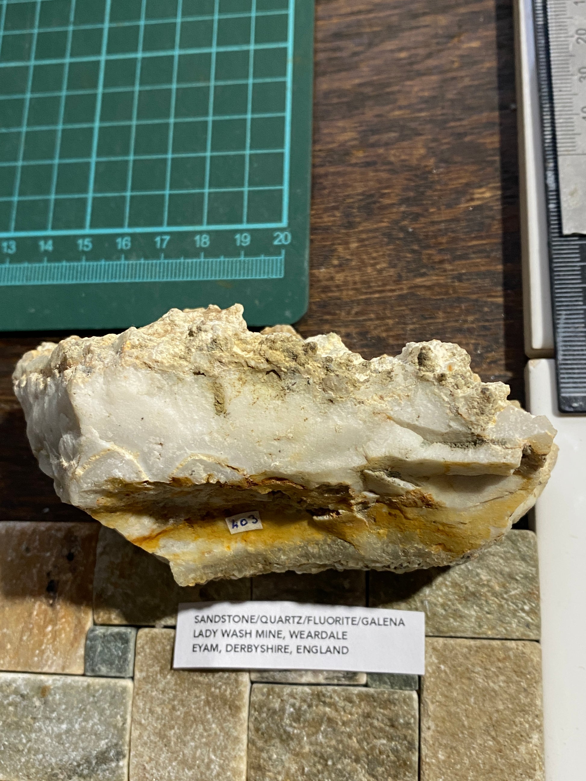 SANDSTONE-QUARTZ-FLUORITE-GALENA SEQUENCE : LADY WASH MINE, DERBYSHIRE, 360g MF4728